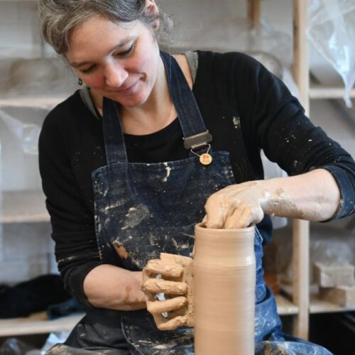 Tijdens dit atelier bouwen we een grote vaas op met kleirollen, ook wel colombins genoemd, op de draaischijf. Je start met het centreren van een hoeveelheid klei ( 1 a 2 kg) waarmee jij comfortabel kunt werken, en vormt de bodem en het eerste deel van je vaas. Daarna voegen we de kleirollen toe om stap voor stap hoogte en vorm op te bouwen.